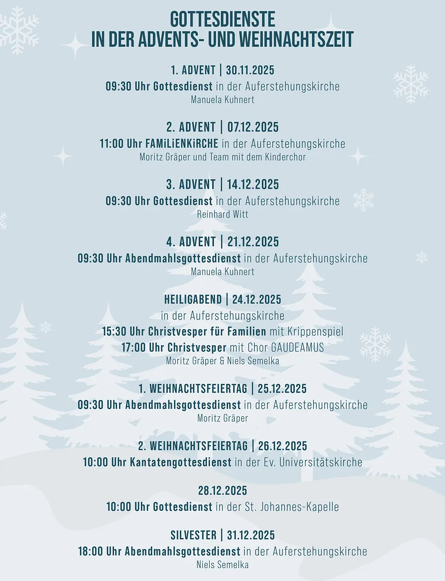 Am 2. Advent (7.12.2025) feiern wir um 11 Uhr eine vorweihnachtliche FAMiLiENKiRCHE. Der Kinderchor und die Band gestalten die Musik, es gibt eine wunderbare Geschichte über Sterndeuter aus fernen Landen und im Anschluss an den Gottesdienst einen kleinen Adventsmarkt im Innenhof mit Waffeln, Punsch, Stockbrot, einem Basartisch, gebasteltem aus dem Paul Schneider Haus und einem Veggie-Grillstand. Der Grillstand ist der Preis, den wir beim Stadtradeln erstrampelt haben. Wir freuen uns auf euch!