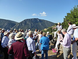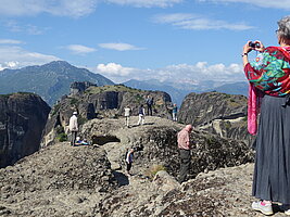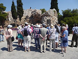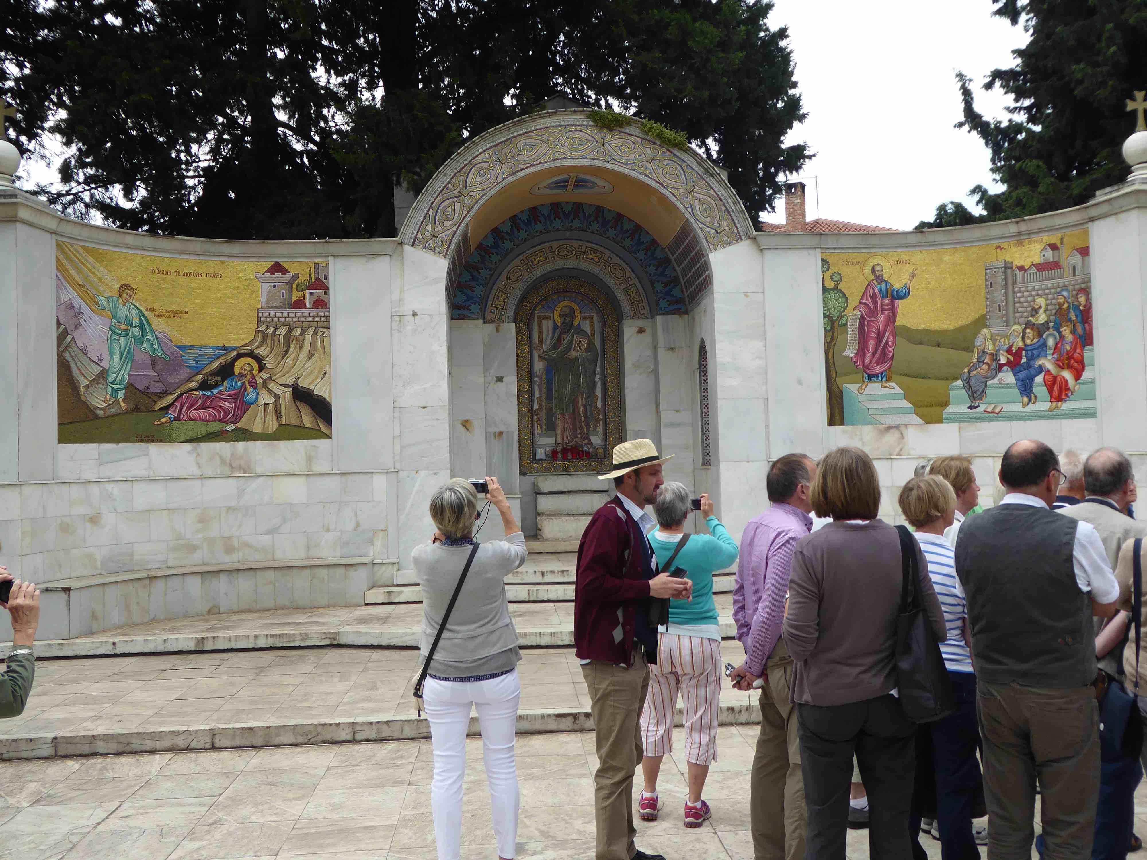 Am Donnerstag fuhren wir nach Veria. Dort sahen wir die modernen Mosaiken, die den Apostel predigend zeigen, außerdem ein Paulusdenkmal. Nahe dieser Stadt liegt Vergina mit einem imposanten Museum, herumgebaut um das Grab des 336 v. Chr. von seinem Leibwächter ermordeten Philipps II, des Vaters Alexanders des Großen. Dort erlebten wir den einzigen Regen der Reise. Die Temperaturen waren übrigens so wie z.Zt. in Münster. Wir fuhren dann noch nach Alambaka nahe den orthodoxen Meteora-Klöstern. Diese liegen auf hohen Felsen, ein UNESCO- Weltkulturerbe. Am Freitagmorgen konnten wir teils über steile Treppen (300 Stufen!) zwei der ursprünglich 24 Klöster besichtigen, ein Nonnen- und ein Mönchskloster.
