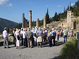 Danach ging es nach Delphi, wo wir wieder ein Hotel für eine Nacht bezogen. Am Samstag sahen wir im Apollo-Tempel den „Nabel der Welt“ und den Weissagungsort der Pythia. (Berühmtester der oft zweideutigen Weissagungen war die Antwort an König Krösus, er würde ein großes Reich zerstören, wenn er einen Krieg begänne – es wurde sein eigenes!). In der nahen Agora (Marktplatz) konnten wir die Stelle sehen, wo Paulus gepredigt haben soll. Im archäologischen Museum sahen wir u.a. zwei überlebensgroße Jünglingstatuen und einen ebensolchen bronzenen Wagenlenker. Am Abend erreichten wir die mit 3.5 Mio Einwohnern größte Stadt und Hauptstadt Griechenlands. Einige Unentwegte gingen noch zu Fuß in die Altstadt, andere sahen bei einem Glas Wein von der Aussichtsplattform des Hotel die erleuchtete Akropolis mit dem Parthenon-Tempel. Herrlich!