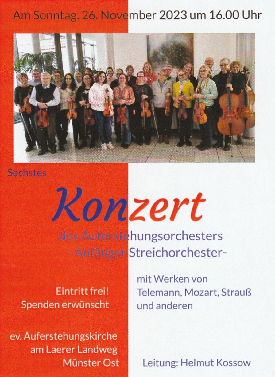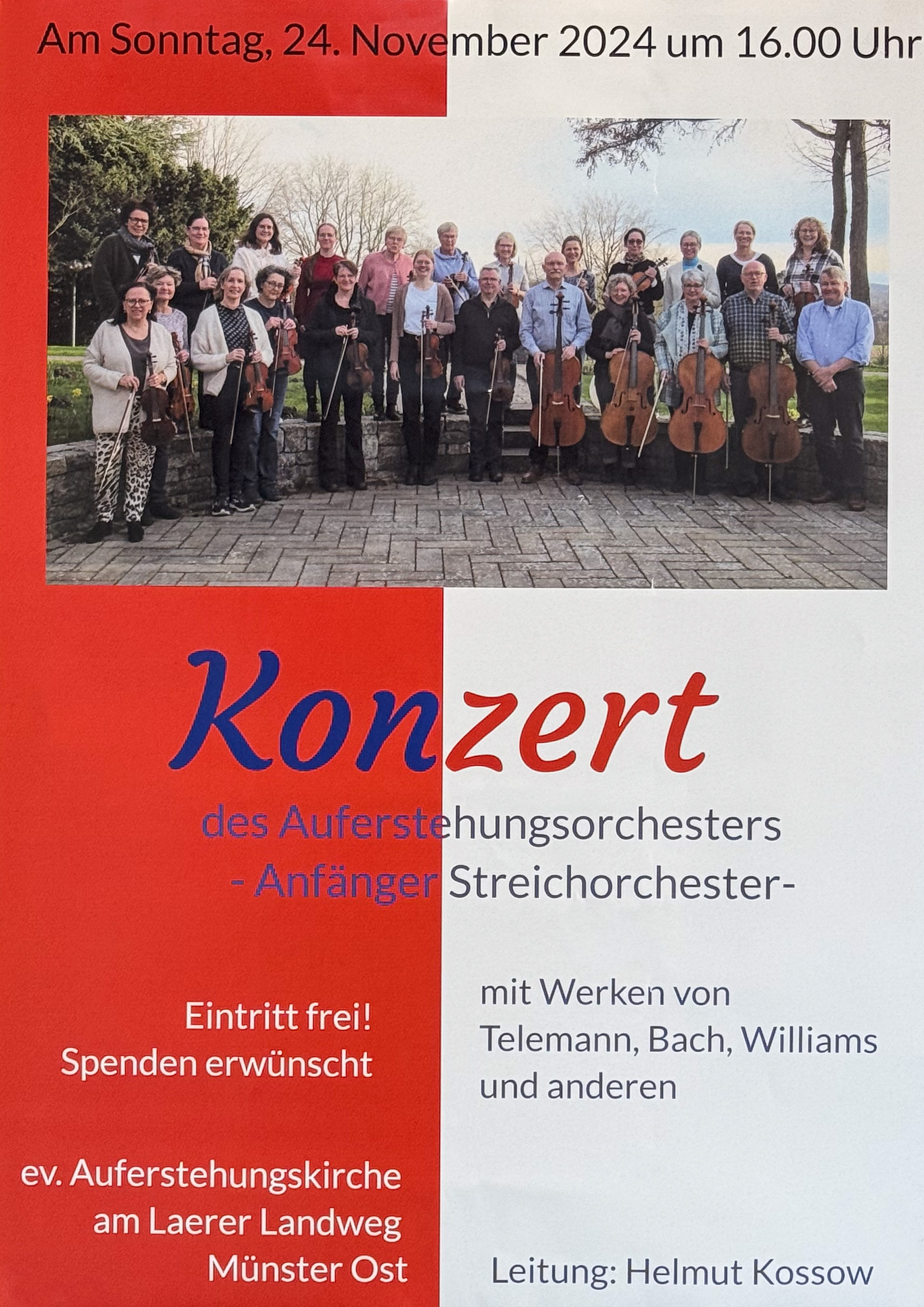 Das Auferstehungs-Streichorchester wird im November 2026 ein besonderes Konzert aufführen. Der Leiter Helmut Kossow hat die Mozart-Oper "Die Hochzeit des Figaro" für das fortgeschrittene Anfängerorchester so umgeschrieben, dass es die Möglichkeit hat, diese wunderbare Musik zu spielen. Da es keine Sänger gibt, wird die Handlung von einem Sprecher zwischen den einzelnen Stücken erzählt.