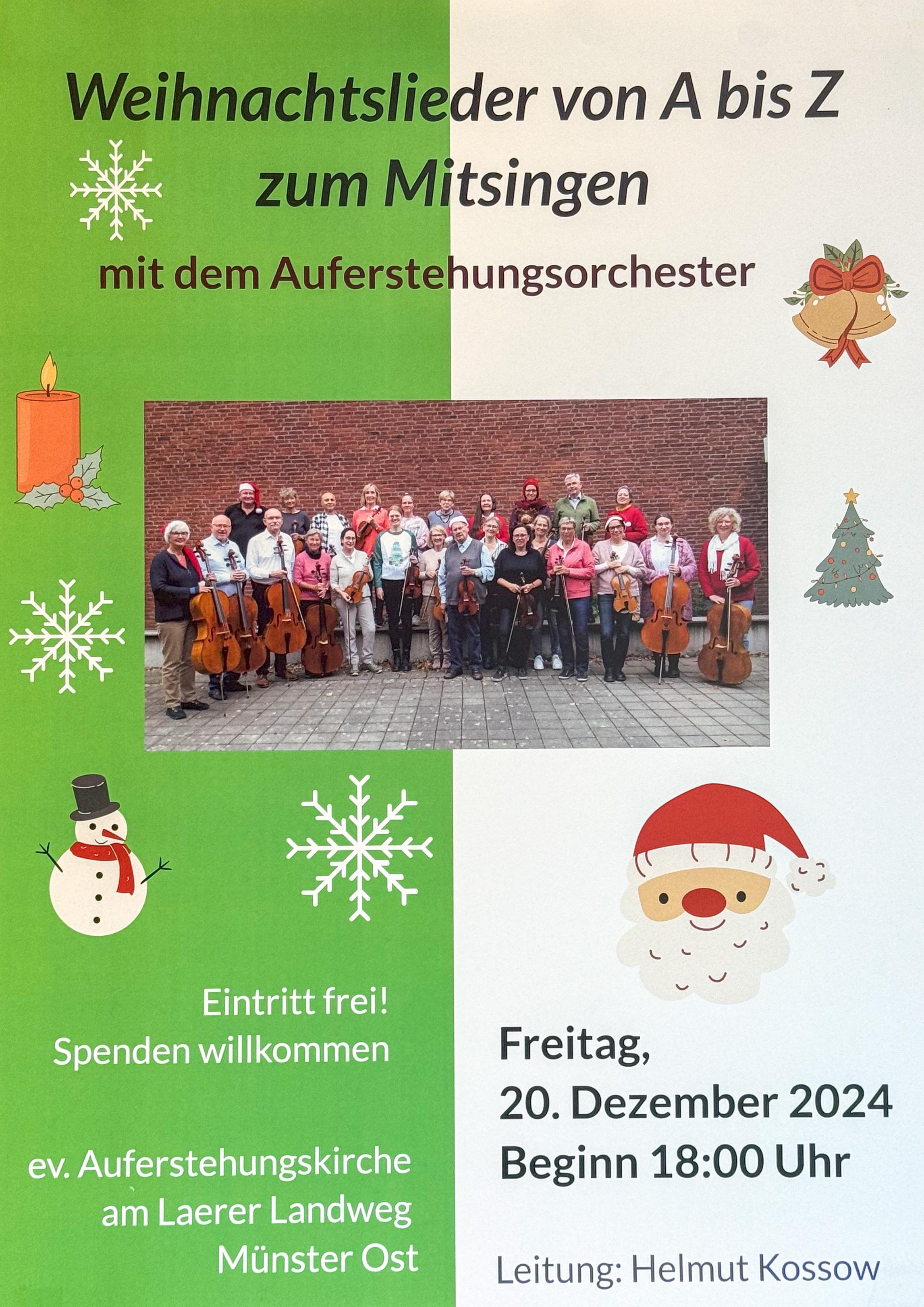 Am 19. Dezember 2025 um 18:00 Uhr besteht in der Auferstehungskirche die Gelegenheit, beim Mitsingen der "Weihnachtslieder von A bis Z" das Streichorchester kennenzulernen und gerne auch persönlich Kontakt aufzunehmen. Eintritt und Glühwein sind frei. Spenden jedoch sehr willkommen.