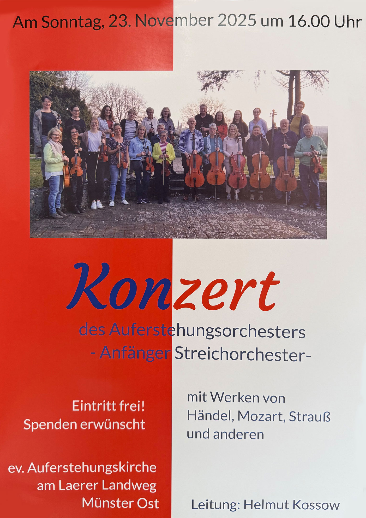 Außerdem besteht am 19. Dezember 2025 um 18:00 Uhr in der Auferstehungskirche die Gelegenheit, beim Mitsingen der "Weihnachtslieder von A bis Z" das Orchester kennenzulernen und gerne auch persönlich Kontakt aufzunehmen. Eintritt und Glühwein sind frei. Spenden jedoch sehr willkommen.