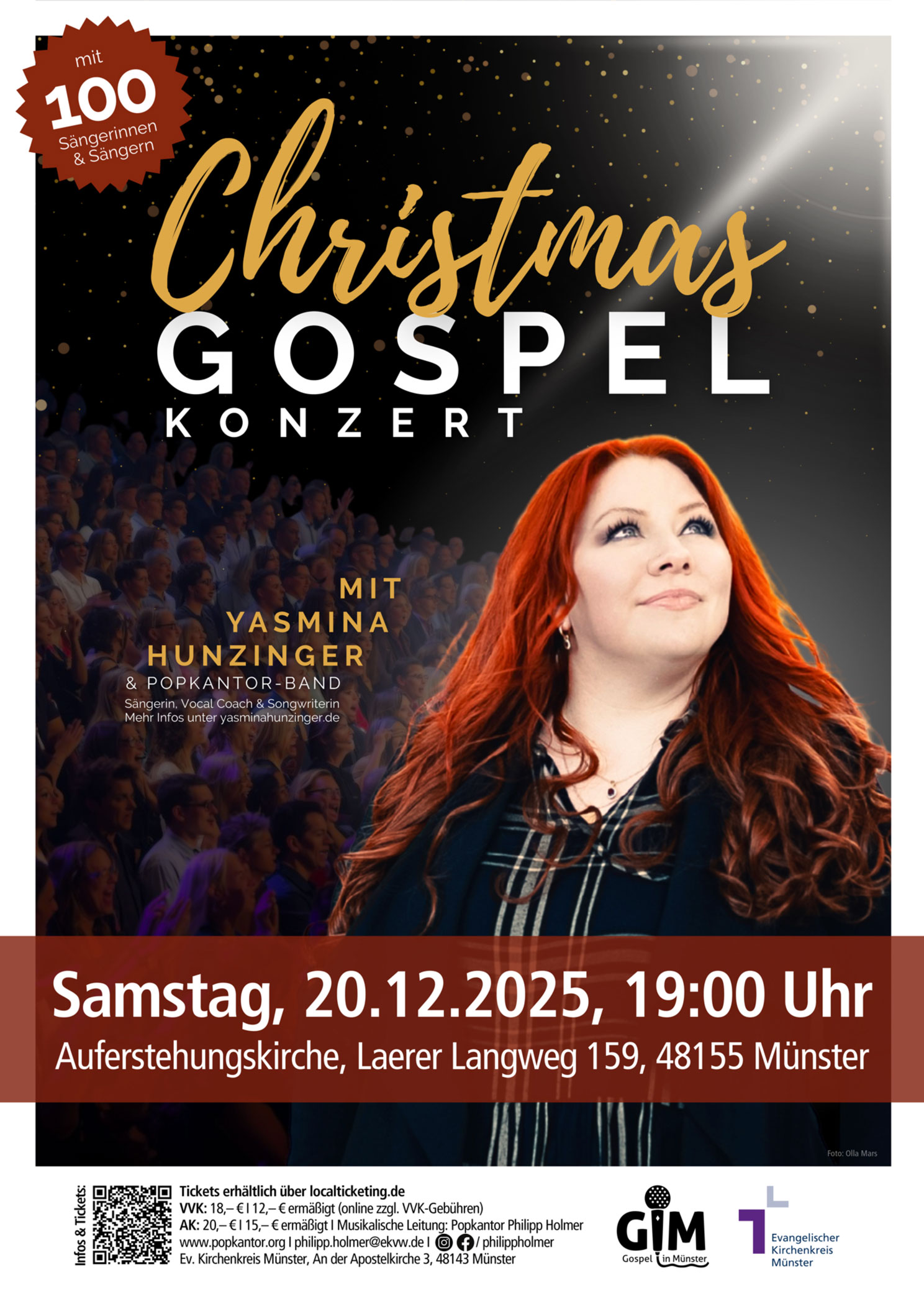 So klingt Weihnachtsfreude! Erlebe ein festliches Gospelkonzert voller Energie, Gefühl und berührender Stimmen – mit Solistin Yasmina Hunzinger, Popkantor Philipp Holmer & Band und 100 begeisterten Sängerinnen und Sängern.